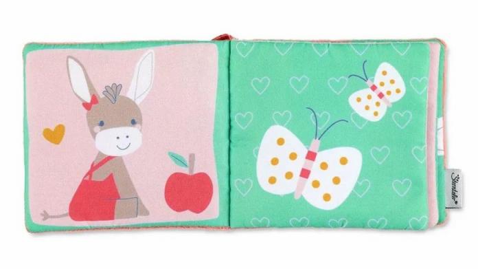 Spielbuch Esel innen bedruckt, mit Knisterpapier, Quietsche, 8 SeitenAltersempfehlung:ab GeburtMaterial:Nicki: 75 % Baumwolle, 25 % Polyester, Flausch: 100 % Polyester, Polycotton: 60 % Baumwolle, 40 % PolyesterDas weiche Spielbuch mit Motiv Esel Emmily in Hellrot und Hellgrün aus Nicki, Flauschstoff und Polycotton ist besonders leicht zu greifen für kleine Kinderhände. Die 8 extra dicken Seiten lassen sich leicht umblättern. Die süßen und farbenfrohen Motive regen die Sinne deines Kindes an und ermutigen zum „Lesen“ und Entdecken. Dank der integrierten Quietsche und dem Knisterpapier ist das Spielbuch auch akustisch ein absolutes Highlight. Durch das praktische Befestigungsband lässt sich das Spielbuch schnell und einfach am Kinderwagen oder am Autositz festbinden und ist somit auch der perfekte Begleiter für unterwegs.
